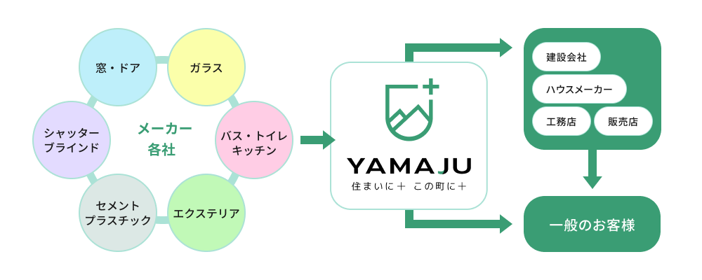 建材商社は、建設資材をつくる「メーカー」と、建物を建てる「建設会社・ハウスメーカー・工務店」などをつなぐハブのような役割です。