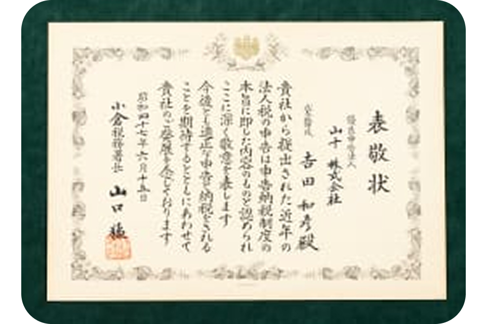 「優良申告法人」として10回も表彰されている誠実な経営姿勢も、私たちの誇りです。
