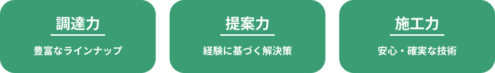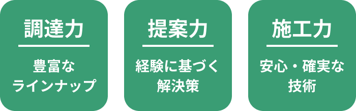 メーカーの膨大な商品ラインナップから最適な製品を選び抜く「調達力」。 お客様の理想を形にする「提案力」。そして、確かな技術で現場を仕上げる「施工力」。