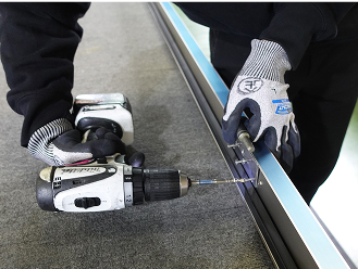 (倉庫内の商品やサッシの組み立て、ガラス切断を見学します)